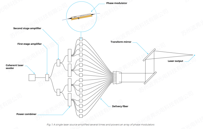 具有窄線寬(kHz量級(jí))的單一激光器被多級(jí)光纖放大器放大幾倍的功率,并饋送到相位調(diào)制器上(每個(gè)激光通道上放置一個(gè)相位調(diào)制器),對(duì)每個(gè)通道光束分別應(yīng)用相位校正。調(diào)制器動(dòng)態(tài)地校正光路的相位差,并保持輸出激光束的空間和時(shí)間特性。換言之,通過實(shí)時(shí)控制多個(gè)激光器的相對(duì)相位來(lái)組合多個(gè)激光器,可以永久地保持干涉的最大化,從而保證合成期間的最大功率效率。
