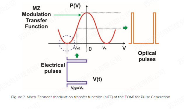圖2顯示了強度電光調制器的傳輸函數(MTF)產生光脈沖的原理。對于脈沖寬度約為1ns的BOTDA應用,10Ghz帶寬的EOM和小于100ps的上升/下降沿完全符合要求。另外EOM能夠產生并維持的高消光比(ER,也可理解為信噪比)脈沖,對BOTDA系統也是至關重要的。