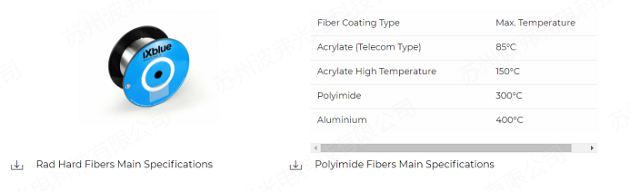 傳感光纖:在一般情況下,標準SMF光纖就足夠了;但溫度超過85度、 光纖的標準涂覆層不能承受如此高的溫度,會熔化。iXblue提供含酰化高溫涂層的光纖最高可達130°C、 含聚酰亞胺涂層高達300°C,甚至鋁涂層高達400°C。在空間或核輻射環境中,還需要具有抗輻照保證(Radiation Induced Attenuation-RIA)的特定光纖。