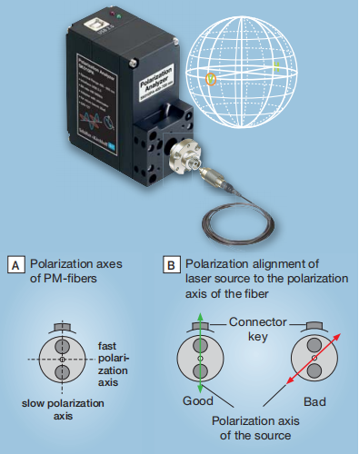 SK010PA 偏振分析儀提供了將光源的入射偏振方向與光纖偏振軸對齊以及測量產生的偏振消光比 (PER) 的功能。保偏單模光纖以兩個垂直的主態引導耦合輻射,即光纖偏振軸(也稱為慢軸和快軸)。光纖耦合輻射的偏振消光比PER是是耦合到光纖兩個偏振軸的光功率級之間的比率。偏振分析儀用于通過旋轉光源的輸入偏振軸來優化光源的偏振軸與光纖的偏振軸的偏振對準。對于兩個偏振軸,傳輸速度不同。當線偏振輻射不完全耦合到這些狀態之一時,輻射被分成兩個垂直分量,分別耦合到光纖的偏振軸。在光纖出口處,傳輸速度的差異會導致相移,該相移也取決于光纖的長度。如果該相移小于激光源的相干長度,則輻射重新組合為橢圓偏振態;如果激光源的相干長度小于相移,則出現的輻射被部分去偏/消偏(depolarized)。偏振分析儀支持兩種情況的調整。