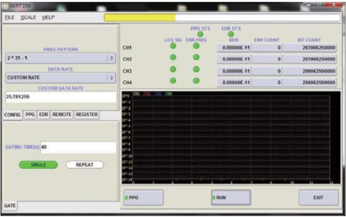 PPG-250C-x-4CH內置超穩定、低抖動時鐘,EDR-250C-4CH帶有正恢復時鐘 (CDR) 使其非常適合光纖鏈路測試。這些單元可通過USB,GPIB端口程控,可以實現自動測試。