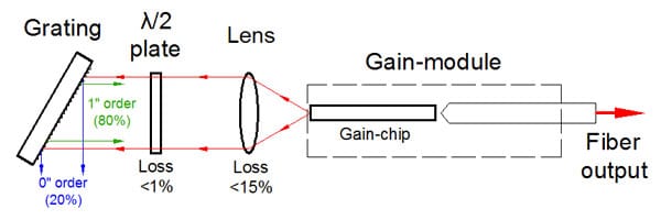 該設備包括帶有彎曲條紋的“C型”增益芯片。條紋傾斜的刻面專為外部反饋而設計,并具有深層 AR 涂層,從而使芯片波導的背反射極低。它確保了自激的阻斷,并消除了在外腔系統中操作時與復合腔相關的問題。這導致在整個調諧范圍內具有高邊模抑制比 (SMSR) 的非常精細的譜線。具有垂直條紋的刻面具有適當的反射率(通常在 5-15% 的范圍內),以同時提供寬波長調諧和高輸出功率。標準器件中這一方面的反射針對在外腔設置中的操作進行了優化,該設置為芯片提供了有效的反饋(約 50%)(如圖所示)。對于反饋較低的方案,我們建議使用在刻面上具有不同涂層的定制設備,以提供優化的反射。