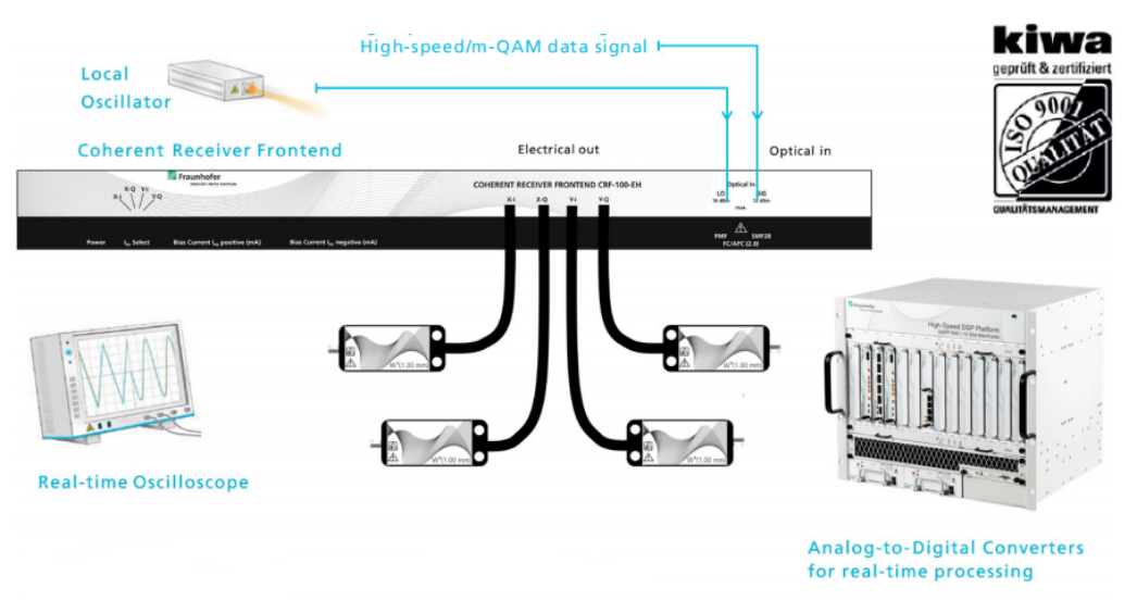 緊湊型19英寸機箱中的光學(xué)相干接收機,100 GHz帶寬,包括C或L波段可選LO激光器,高速光學(xué)雙偏振m-PAM和m-QAM信號的相干檢測。