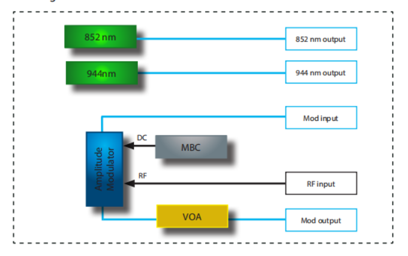 ? 內(nèi)嵌兩個(gè)激光源,一個(gè)852 nm和944 nm低RIN DBR激光器。為了便于使用,省略了一根外部接插線,將激光輸出連接到調(diào)制器輸入光端口。波長和功率可通過前面板控制或ModBox軟件接口進(jìn)行調(diào)整。